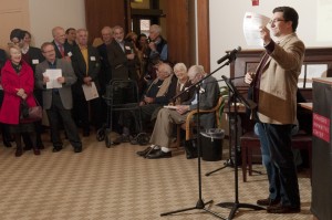 Derek Miller, right, and Mason Flink on piano entertain the crowd with songs lampooning the humanities as subject and profession at the Humanities Book Celebration. Local luminaries were on hand: That’s author Marilyn Yalom in the red coat, Aron Rodrigue next to her, Matthew Tiews behind them both. John Hennesy over Aron’s shoulder, Stephen Hinton next to him looks unamused in the maize-colored shirt. Charles Junkerman listens as he quaffs his chardonnay. Joseph Frank, author of the acclaimed 5-volume Dostoevsky series, sits with his walker, with wife Marguerite whispering to him. John Felstiner, author of “Can Poetry Save the Earth?” stands in the doorway.