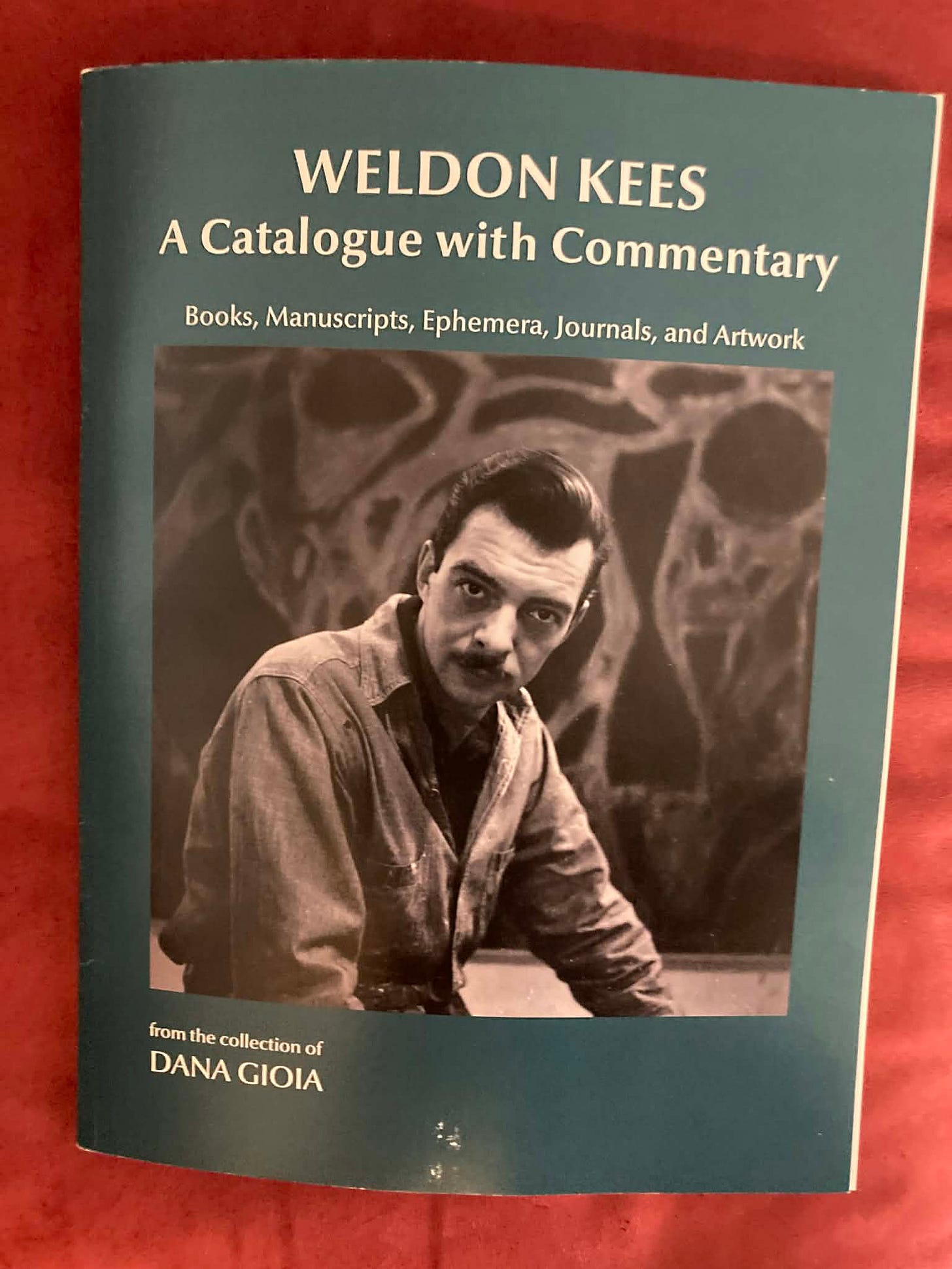 From my mailbox: Dana Gioia, poet and former chairman of the National Endowment for the Arts, sent me the latest fruits of his labors. Dana has long been a champion of the of the overlooked poet Weldon Kees (1914-1955). According to poet Donald Justice, “Kees is original in one of the few ways that matter: he speaks to us in a voice or, rathre, in a particular tone of voice that we have never heard before.” Dana has just published a catalogue of his own collection with commentary, including works of fiction and non-fiction, broadsides, journals, music and recordings, critical works, and more. Here is the preface: